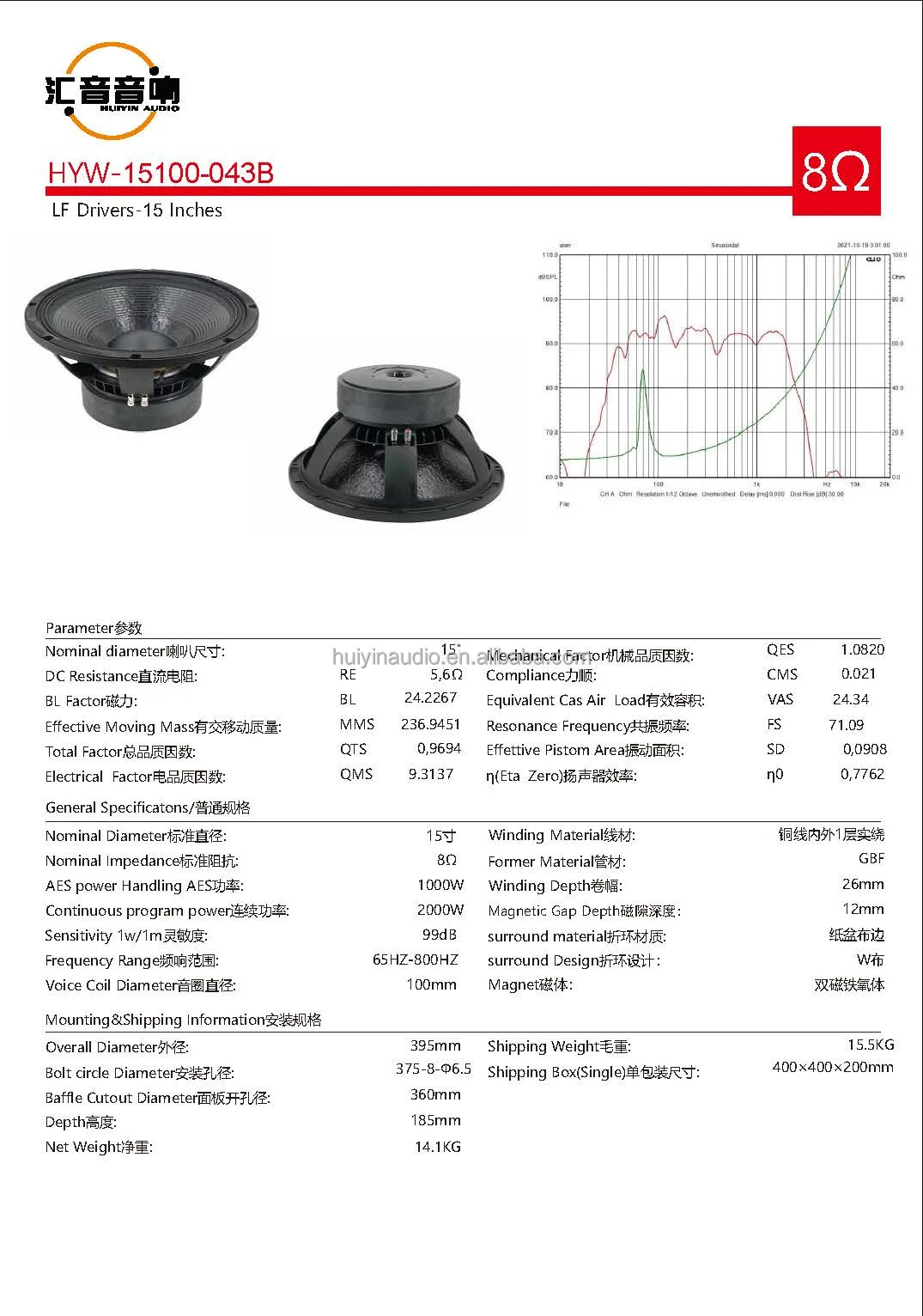 15 Duim Luidsprekers Groot Krag 1000watt 8ohm Professionele Buitedeur-luidspreker 15 Duim Subwooferluidsprekers 15100-043