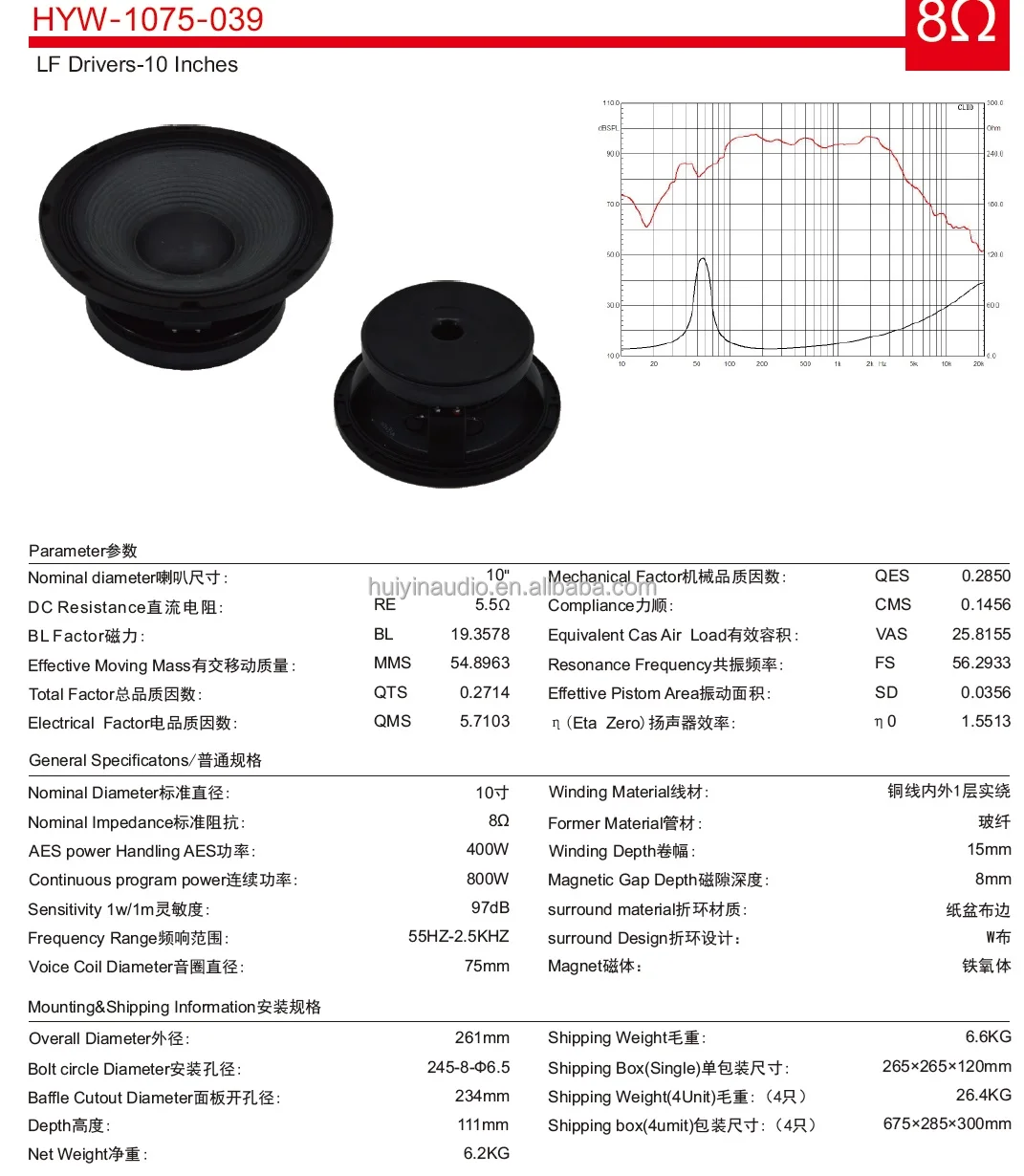 1075-039 Ниска цена 10-инчов говорител 400W RMS 3-инчова бобина 190 мм феритен магнит Професионален средночестотен басов говорител за линейни масивни системи