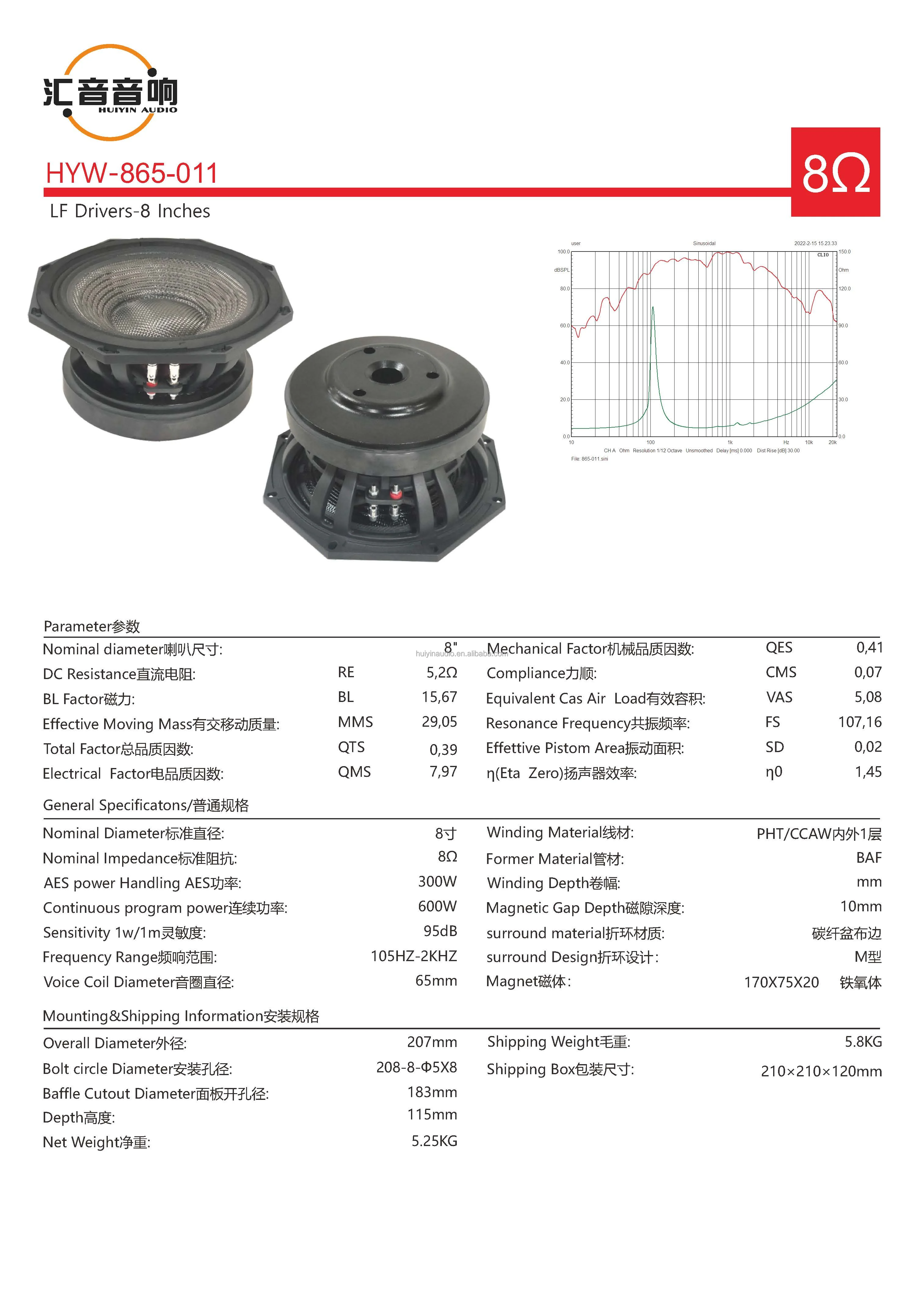 865-011, zortzikia, 8 hazierako audio profesionalerako erdiko-grabe altzairua, 300 W RMS, 2,5 hazierako katxila, karbonozko fibra-begiazkoa, ferrita imana, lerro-matrizea