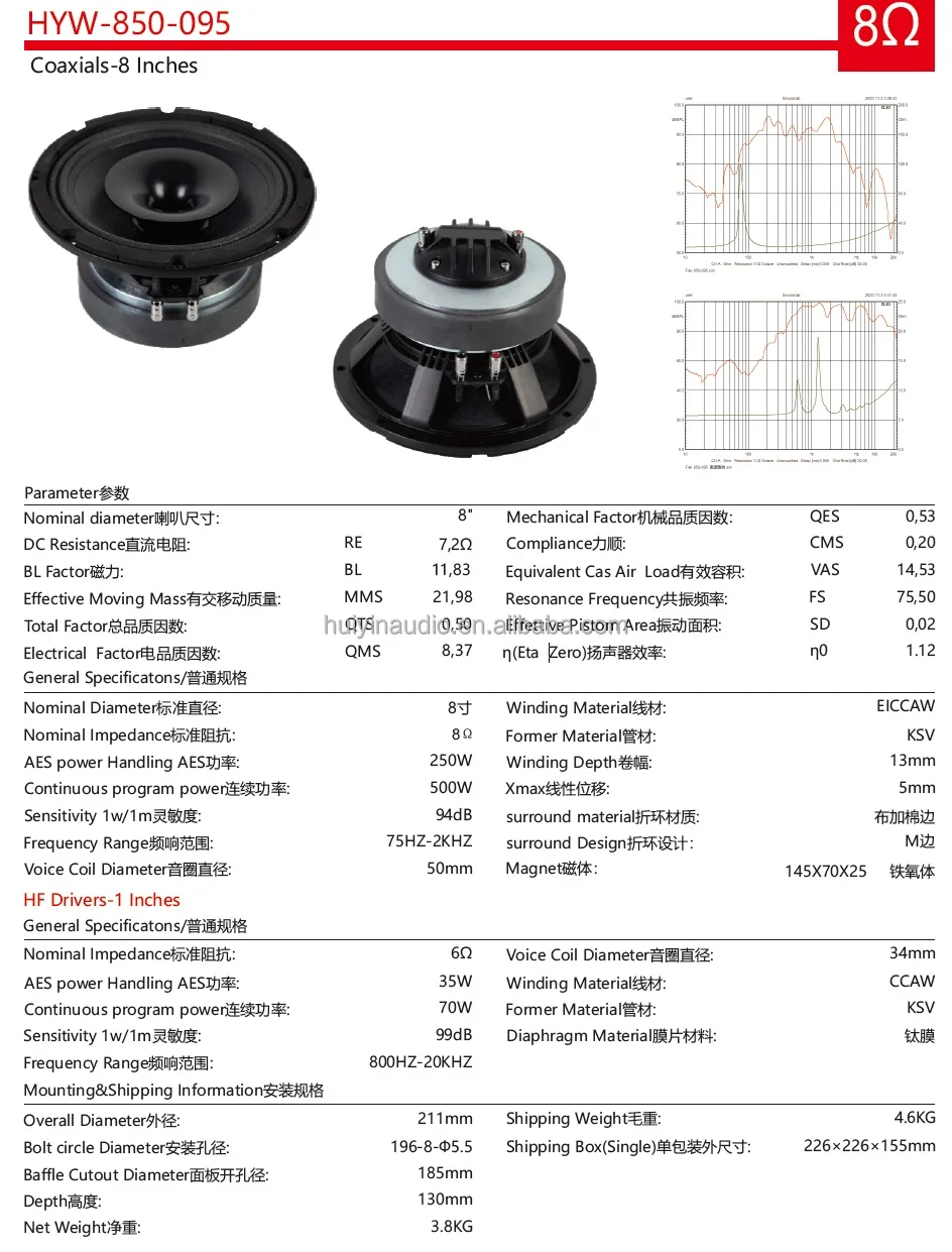 speaker Koaksial Mobil 8 Inci Ferrite Single Coil 850-095 dengan Bluetooth 250W RMS Kerucut Kertas Driver HF 1 Inci Audio Full Range