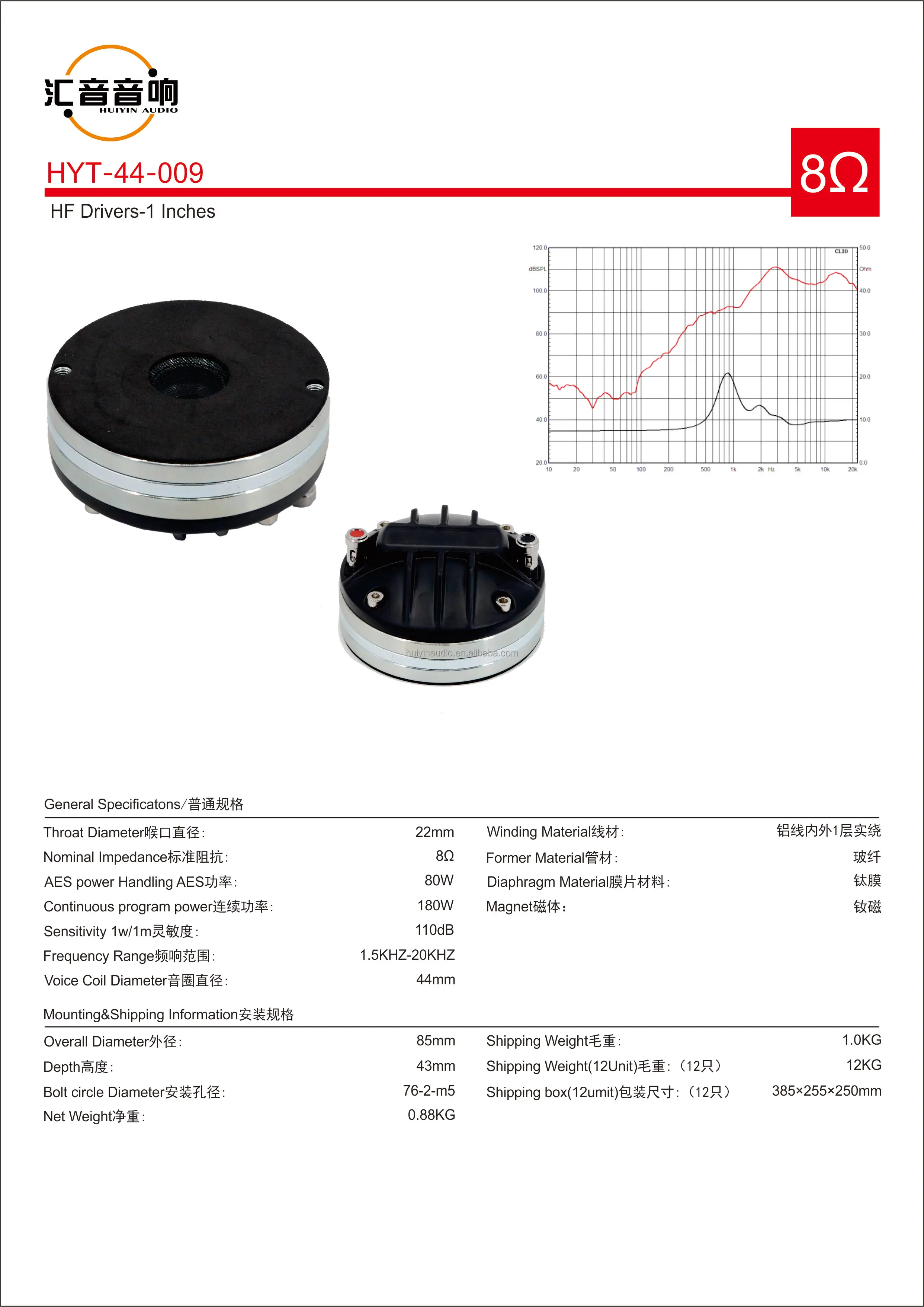 HUIYIN HYT-44-009 OEM 1インチ ネオジム HF コンプレッションドライバー 極めて大音量ホーントゥイーター RMS 80W 110db 22MM スロートトゥイーター