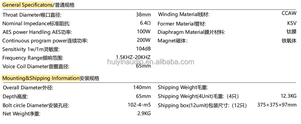 ຕົວຂັບອັດສະລິຍະ HF ຂະໜາດ 2.5 ນິ້ວ HYT-65-001 ຟ້ອງໄຟຟ້າ Ferrite 100W RMS 104db ໂທຣດ 38MM ຕົວສົ່ງສຽງຄວາມຖີ່ສູງ ສຳລັບລະບົບເສີຍງແຖວ