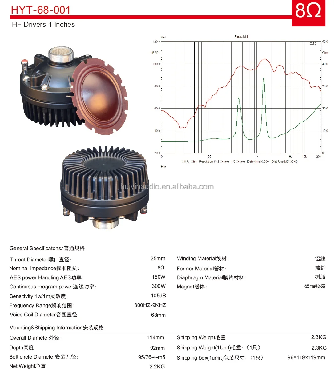 Profesionāls audio 2,5 collu neodīma kompresijas HF draiveris ar 150 W RMS 1 collu rīkles 68 mm spoles 65 mm neodīma augstfrekvences skaļruni 68-001