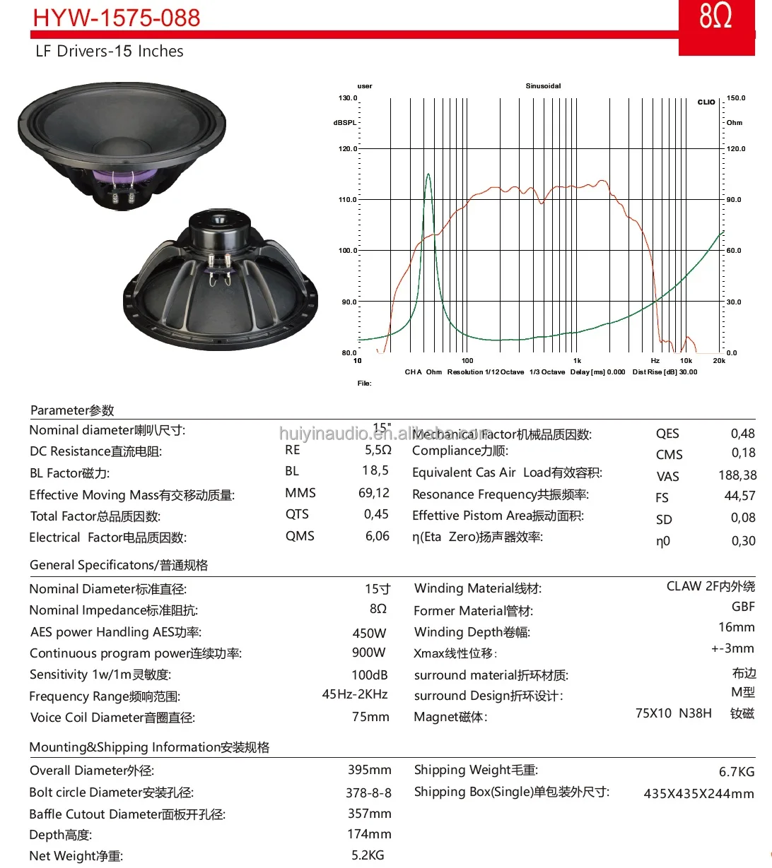 प्रोफेसनल ऑडियो भिडियो प्रकाश 1575-088 नियोडिमियम १५ इंच सबवूफर ३ इंच वॉइस कोइल ९००W मैक्स ४५Hz कागज शंकु प्रोफेसनल
