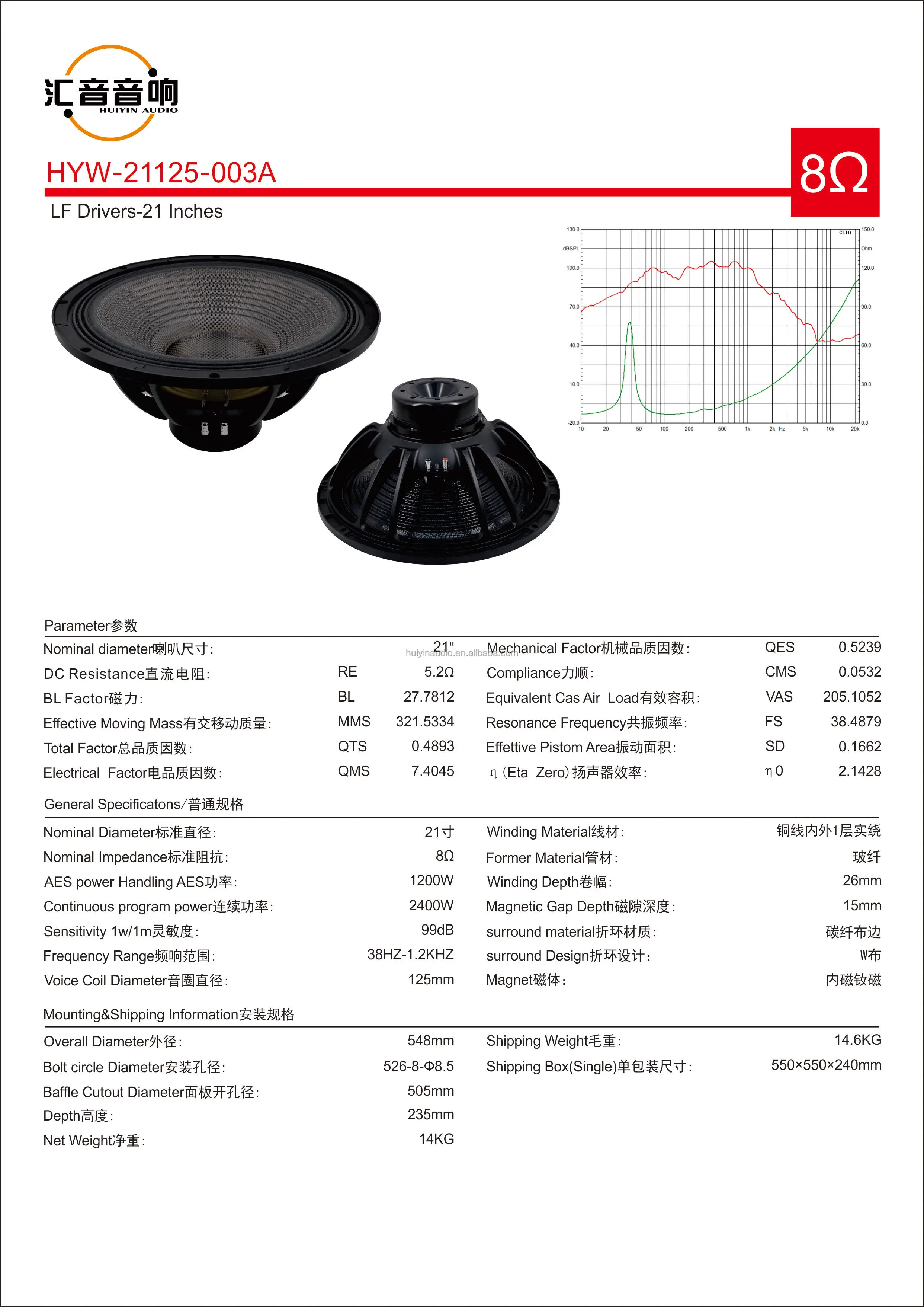 प्रोफेशनल अडियो भिडियो प्रकाश २११२५-००३ए नियोडिमियम २१ इन्च सबवुफर ३००० डब्ल्यू अधिकतम ५ इन्च कुण्डल कार्बन फाइबर कोन ३८ हर्ट्ज वुफर