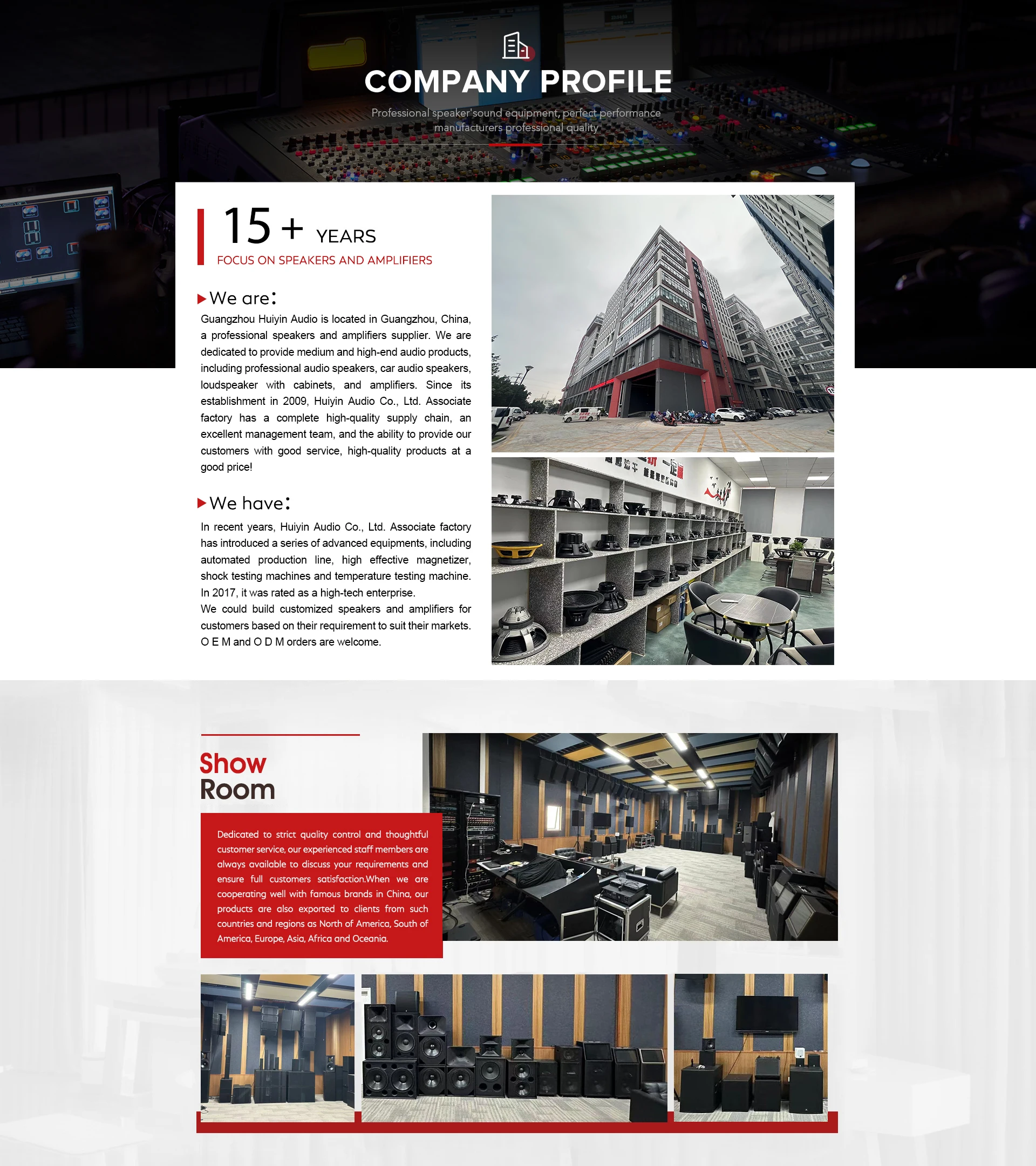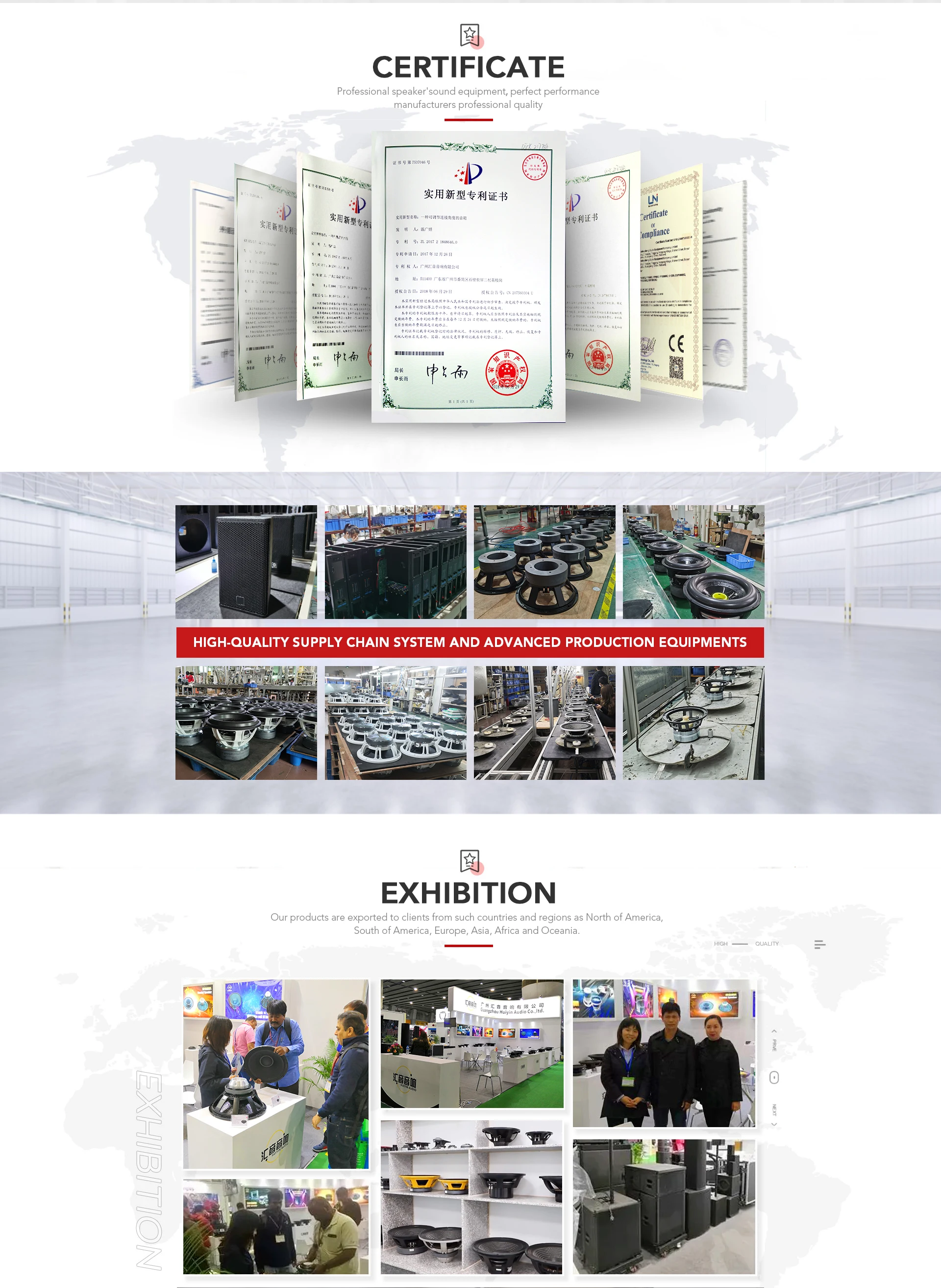 Guangzhou Huiyin Audio Co,. Ltd. is gevestigd in Guangzhou, China, een professionele luidsprekerfabrikant. Het bedrijf is gericht op de productie van verschillende medium- en hoogwaardige luidsprekers, bestaande uit professionele luidsprekers, autoluidsprekers, Hi-Fi-luidsprekers en thuisaudio-luidsprekers. Op basis van meer dan 10 jaar industrieervaring produceert Huiyin voortdurend prijswinnende luidsprekers. Dankzij een sterk R&D-department en ervaren ingenieurs kunnen we ook OEM/ODM-producten ontwerpen en fabriceren volgens uw ontwerp en speciale eisen. Huiyin wordt een grootbedrijf met onderzoek-, productie-, montage- en marketingsvaardigheden. Onze producten worden wereldwijd verdeeld aan klanten uit allerlei landen. Bij Huiyin is kwaliteitscontrole meer een actie dan een slogan. Strenge kwaliteitscontrole wordt doorgevoerd in alle aspecten van de operaties om de hoge standaarden van topklanten te voldoen. Deze filosofie dringt door in alle niveaus van de productieprocessen, waaronder: (1) Inkomend materiaal controle (2) Controle van halffabrikaten (3) Willekeurige magazijncontroles. Welkom bij OEM-bestellingen! We kijken uit naar het ontvangen van uw vragen!