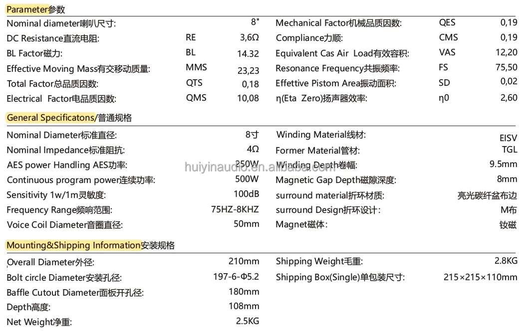 2023 Alto-falantes Médios Populares de 8 Polegadas, Alto-falante de Áudio Automotivo com Cone, 250watts, 100db, Ímã Neo de Bobina de Voz de 2 Polegadas, Carbono Brilhante