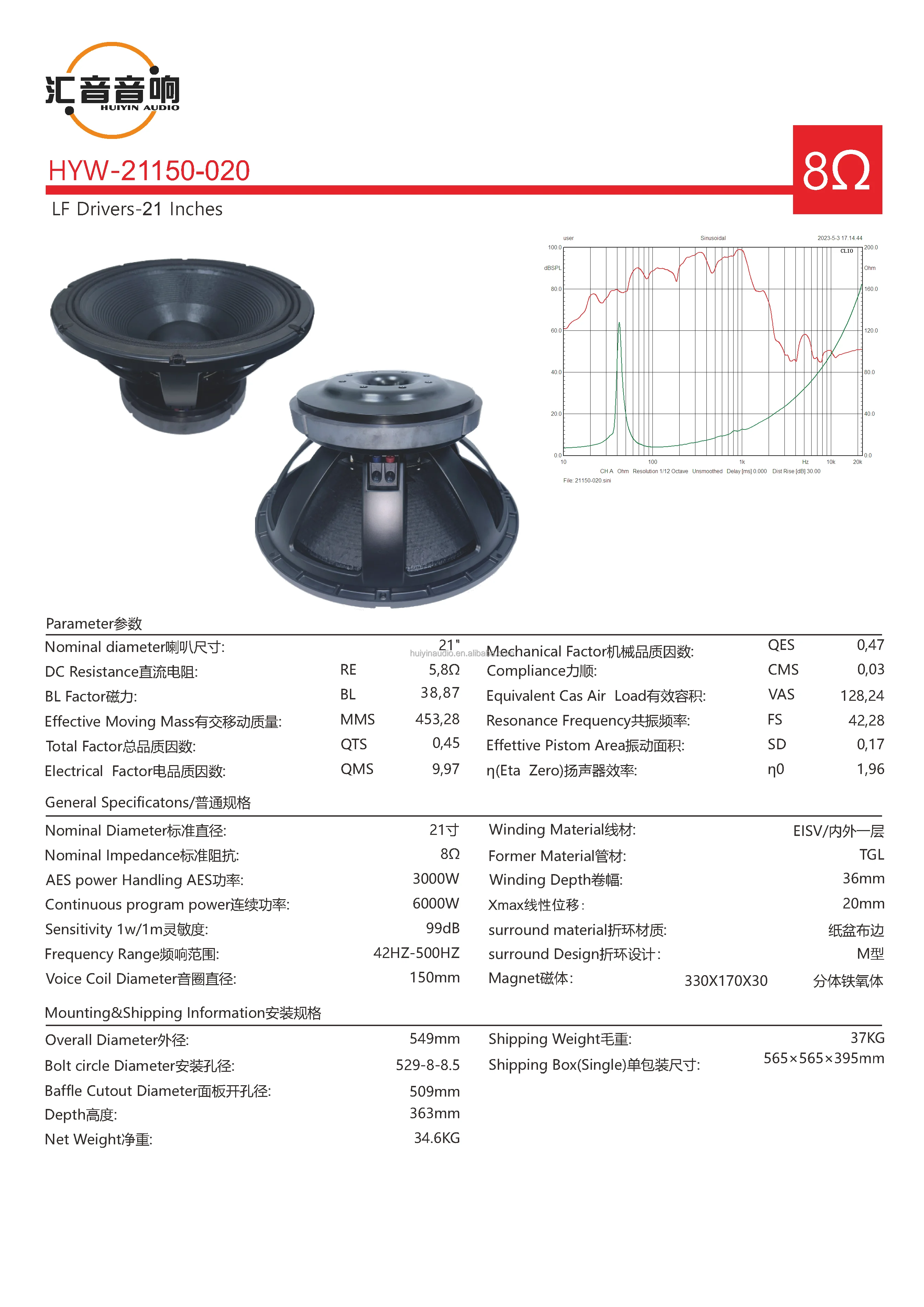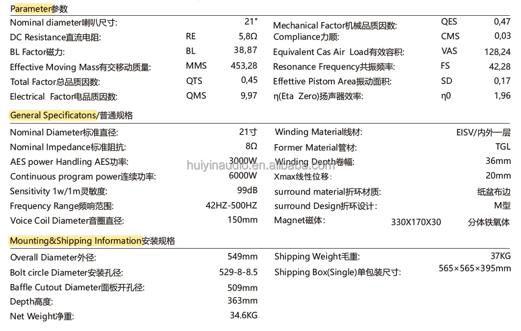 21150-020 ซับวูฟเฟอร์ขนาดใหญ่ 21 นิ้ว 3000W RMS คอยล์ 6 นิ้ว 42HZ 330MM แม่เหล็กเฟอร์ไรต์ ซับวูฟเฟอร์สำหรับระบบเสียงมืออาชีพสำหรับอาร์เรย์ไลน์