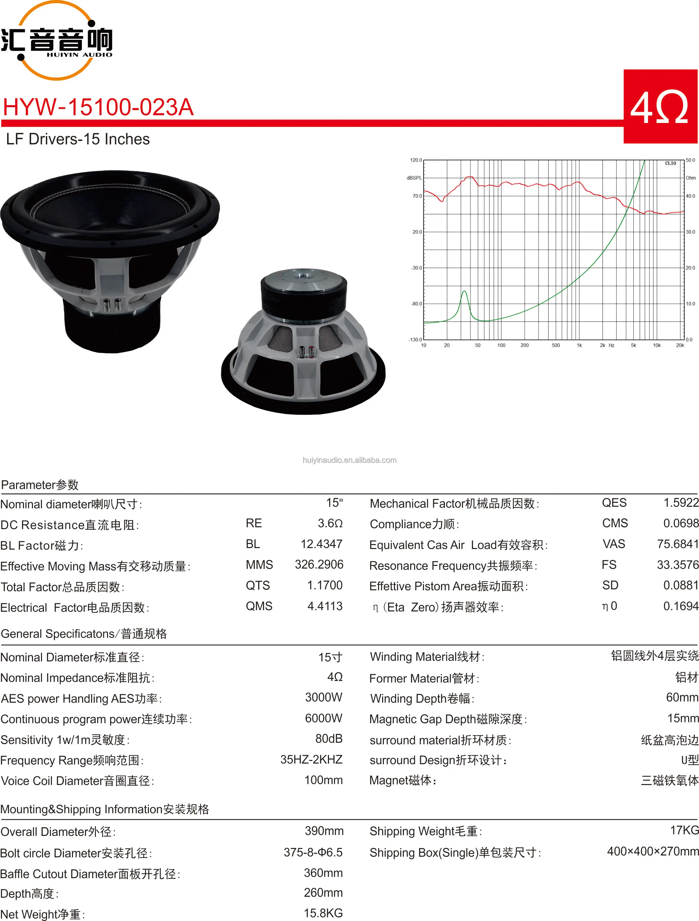 Loa siêu trầm ô tô hai cuộn dây 2/4 ohm, SPL tối đa 90dB, hệ thống âm thanh xe HYW-15100-023E, 15 inch